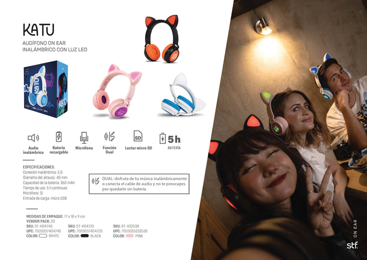 ¡Konnichiwa! Audífonos Katu, para las personas que disfrutan de escuchar y bailar sus canciones favoritas durante horas. Tienen luz LED en las orejas que se encienden en diferentes colores, un micrófono integrado para que puedas contestar tus llamadas, un lector microSD y la duración de la batería es de hasta 5 horas de uso; si se te agota, su función dual te rescatará de cualquier apuro, conecta un cable de 3.5mm para que no pares de escuchar tus canciones favoritas.