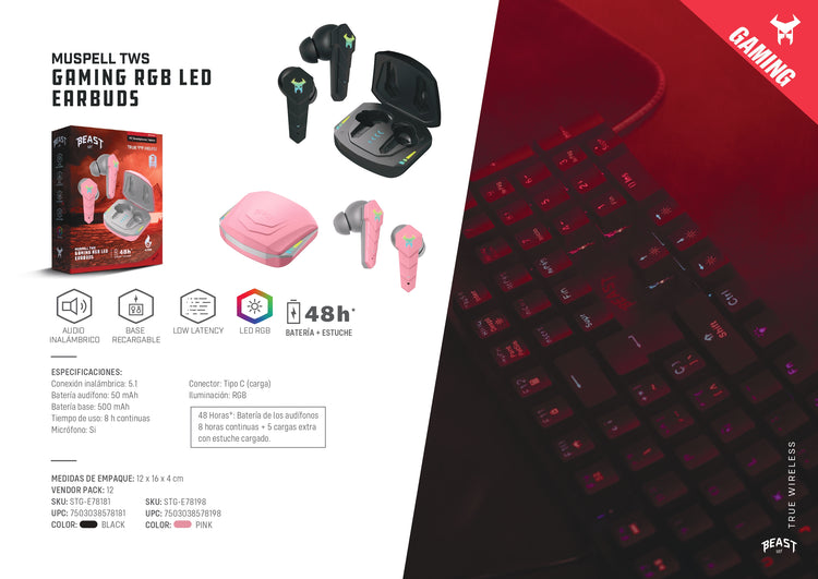 Los audífonos inalámbricos Muspell con tecnología True Wireless son el accesorio indispensable para combatir tus mejores batallas gamer o escuchar tu música, disfruta de hasta 48 horas de batería: 8 horas continuas + 5 cargas extras con el estuche cargado. Tienen baja latencia por lo que escucharás tu música en tiempo real y llevar la delantera como todo un gamer profesional. Podrás entrar en modo juego para iluminar las luces RGB integradas en los audífonos y utilizar el control táctil para subir o bajar el volumen, adelantar o pausar canciones y contestar llamadas