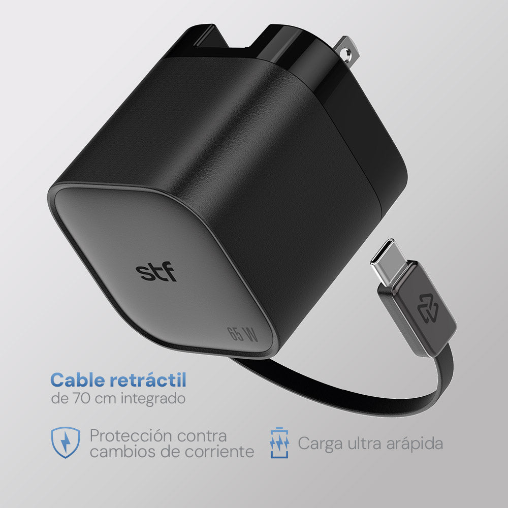 El Cargador STF GaN Retráctil de 65W con Cable Tipo C está diseñado para ofrecer una carga ultra rápida, segura y eficiente, ideal para mantener todos tus dispositivos siempre listos.