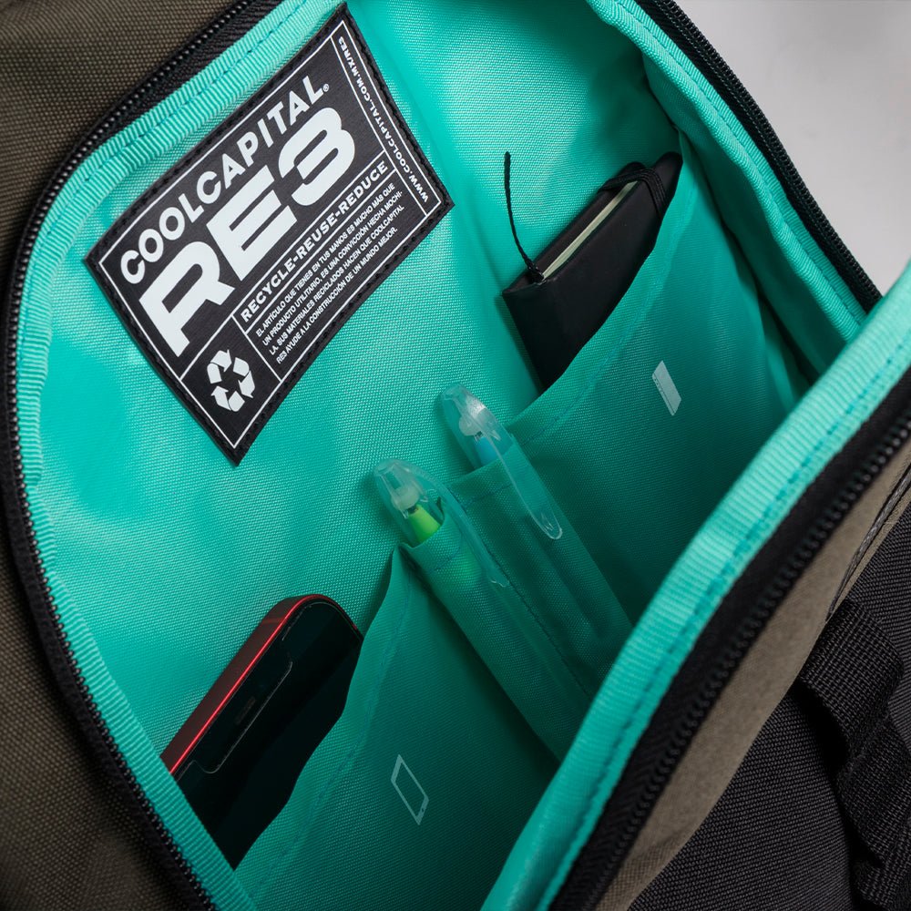 La mochila RE3 está fabricada con materiales reciclados que reutilizan alrededor de 13 botellas plásticas, contribuyendo a reducir residuos en vertederos y mares. Su diseño combina estética y practicidad: múltiples compartimentos, bolsillo lateral, broche frontal, asa para maleta de viaje y compartimento principal acolchado con espacio para laptop de hasta 15” (38.1 cm).
