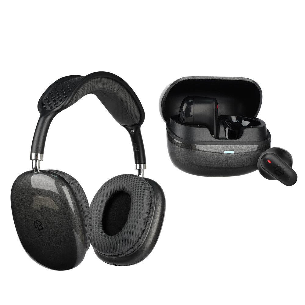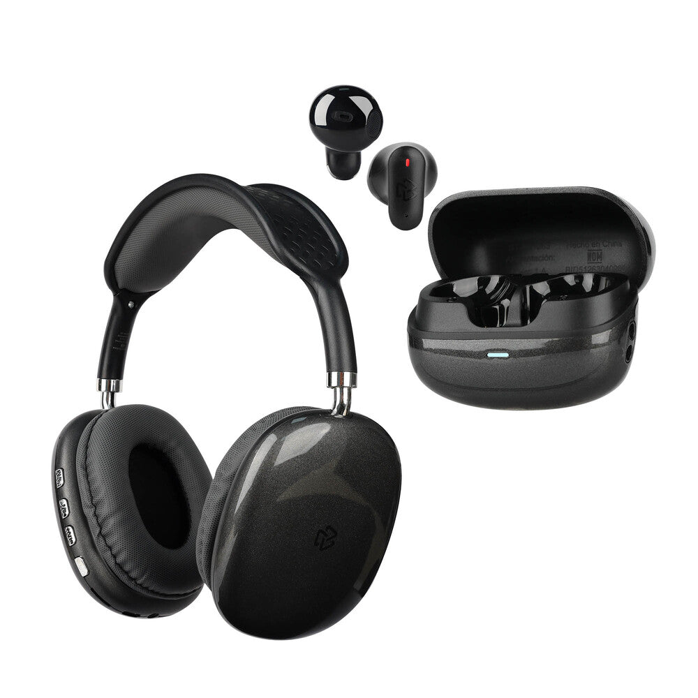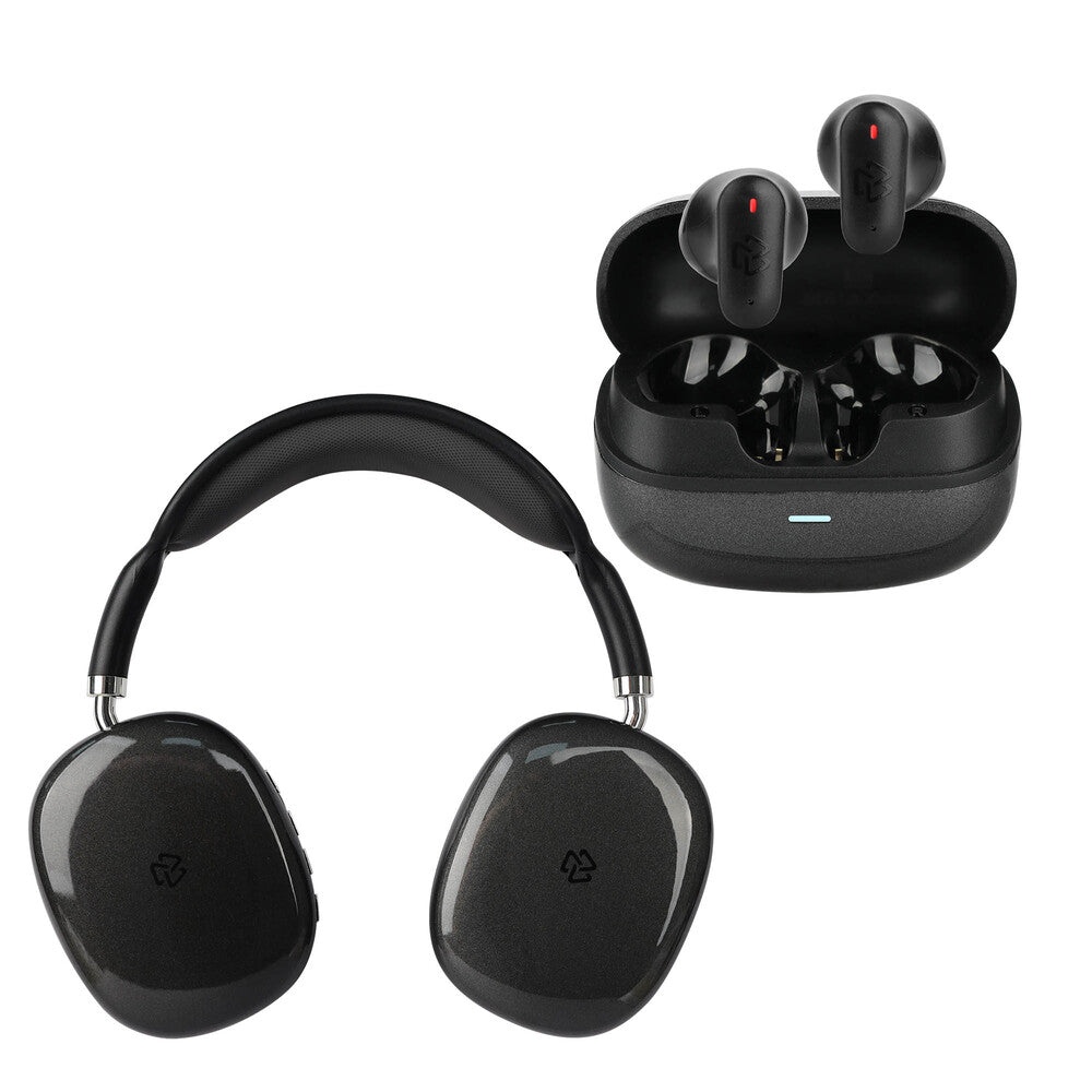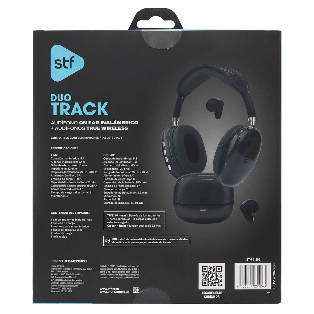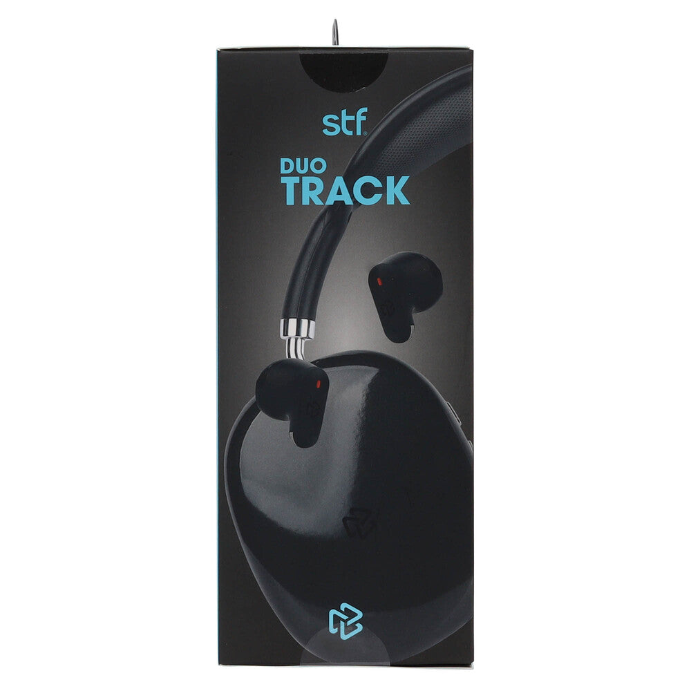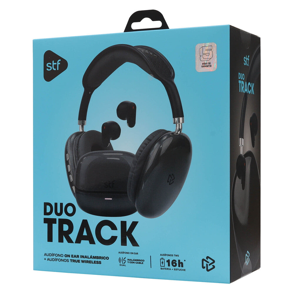 El STF Duo Track es la solución perfecta para quienes buscan versatilidad total en audio. Este kit 2 en 1 combina audífonos on-ear inalámbricos con audífonos true wireless, permitiéndote elegir la experiencia ideal según tu momento del día: comodidad y potencia o libertad total.