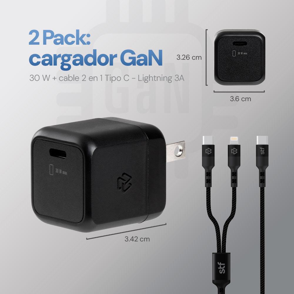 Obtén la solución de carga completa y ultra rápida para tus dispositivos con este 2 Pack de STF. Incluye cargador de pared GaN de 30W y un cable 2 en 1 Tipo C a Lightning de 1.8 metros.