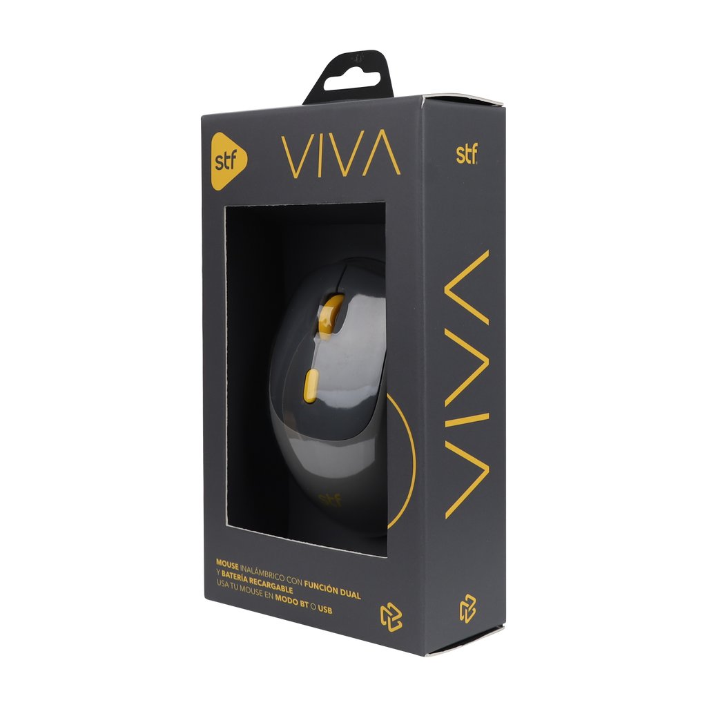 El VIVA Mouse inalámbrico de STF combina versatilidad, precisión y comodidad en un solo accesorio. Gracias a su función dual, puedes conectarlo vía Bluetooth 5.0 o con su receptor USB 2.4 GHz, asegurando una conexión estable y rápida con un alcance de hasta 10 metros.