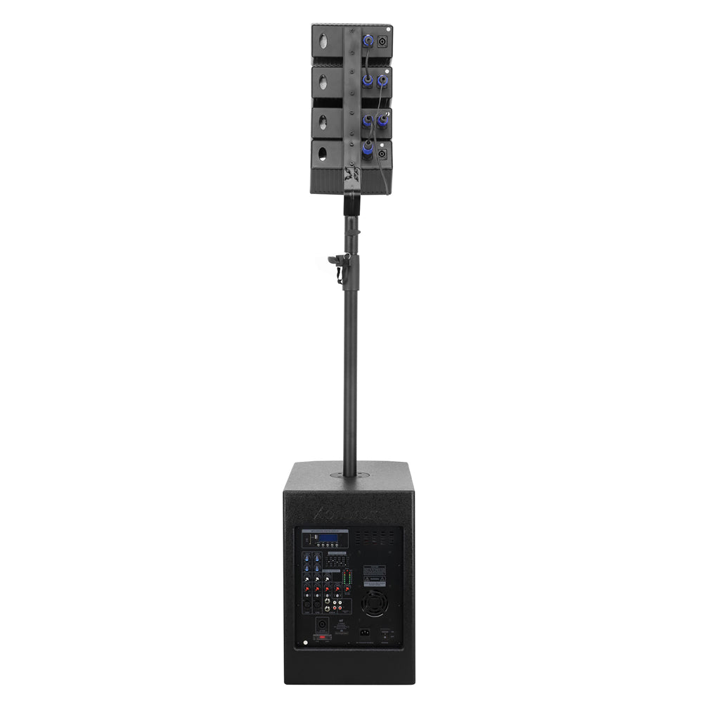 Cuenta con Bluetooth 5.3, entradas USB, Micro SD, RCA y 6 entradas de micrófono (4 XLR + 2 de 6.3 mm), además de 5 ecualizadores predefinidos y efectos de sonido. Su estructura combina MDF en el subwoofer y polipropileno reforzado en el array, garantizando durabilidad y un acabado profesional.