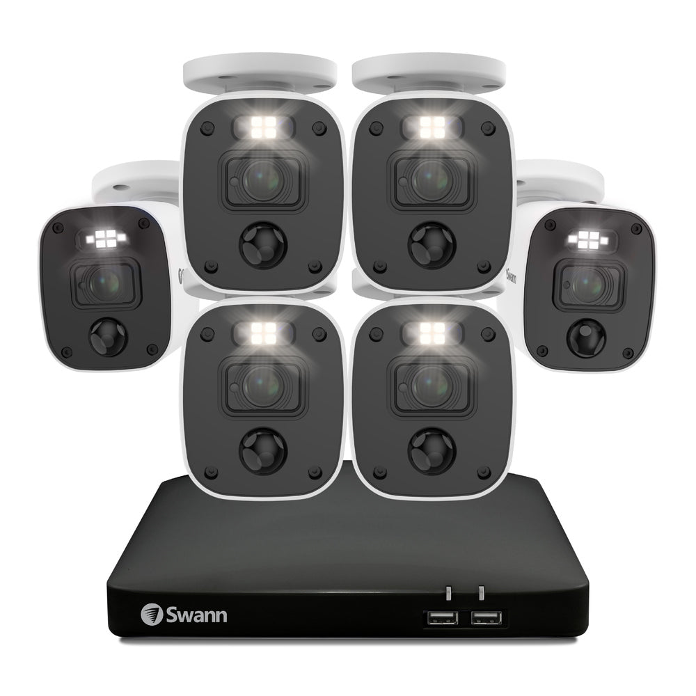 Protege tu hogar las 24 horas con el sistema de seguridad Swann Enforcer™ 1080p Full HD. Este avanzado kit incluye 6 cámaras expandibles con micrófono integrado, grabación de audio y video nítido, además de luces intermitentes rojas y azules que disuaden intrusos al instante.