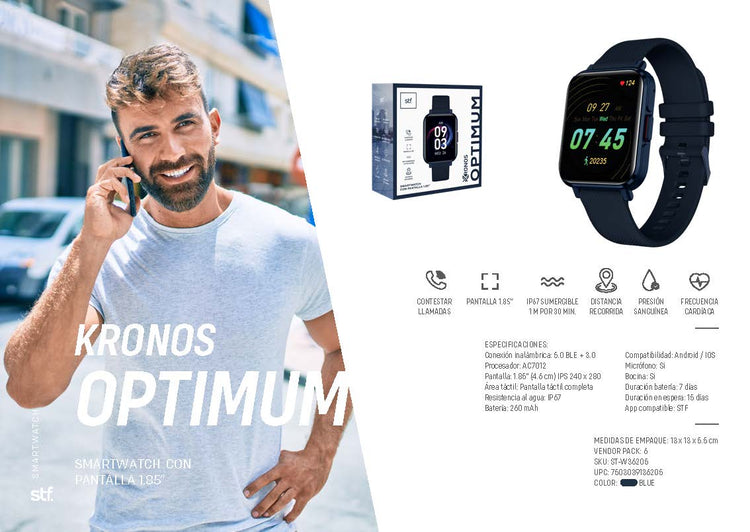 Kronos Optimum es la mejor combinación de diseño y funcionalidad. Es elegante y adecuado para cualquier situación, ya sea en reuniones de negocios o salidas casuales con amigos. Su tecnología resistente al agua IP67 te brinda la libertad de llevarlo contigo incluso en tus aventuras al aire libre, como caminatas por la montaña o excursiones en bicicleta. ¡La pantalla de 1.85" te ofrece información detallada sobre tu agenda diaria, recordatorios de citas importantes, mensajes de texto y más! Con su capacidad de conectividad, podrás mantenerte al tanto de tus asuntos mientras te mantienes activo y en movimiento.
